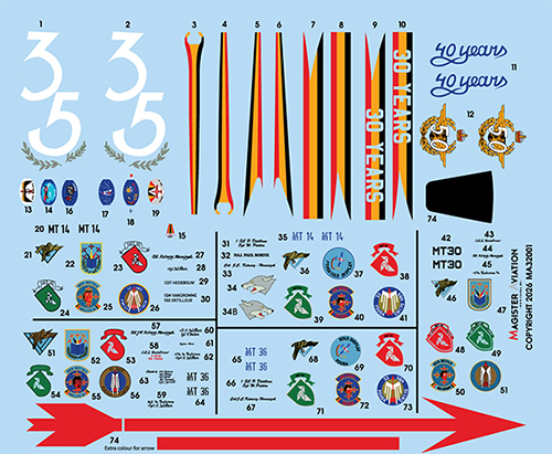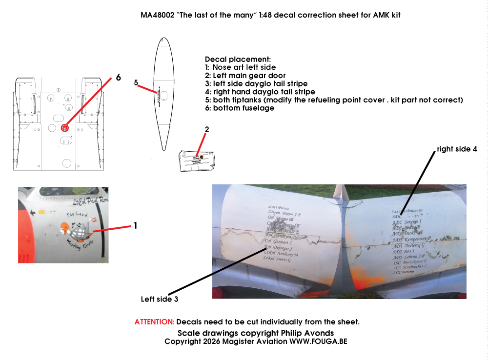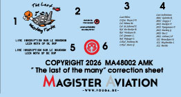 ![]() | 1:32 and 1:48 scale Belgian Fouga “solo + dual”. Belgian Air Force special paint for the 2006 and 2007 solo display and dual display. Fouga numbers MT26 and MT48. All markings. Some decals made from the same files we used to paint the real ones! Including pilot helmet decals. Made for the DACO kit (1:32) and 1:48 kits. Instructions click HERE |