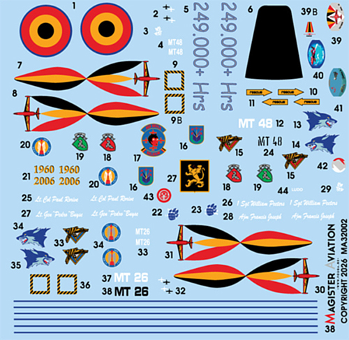 ![]() | 1:32 scale Belgian Fouga “Bluebird”. Belgian Air Force special paint between 1989 and 2002. Fouga numbers MT30, MT14 and MT36. All versions, all markings (30, 35, 40, 50 years + solo displays). Including pilot helmet decals. Made for the 1:32 DACO kit. Instructions click HERE |